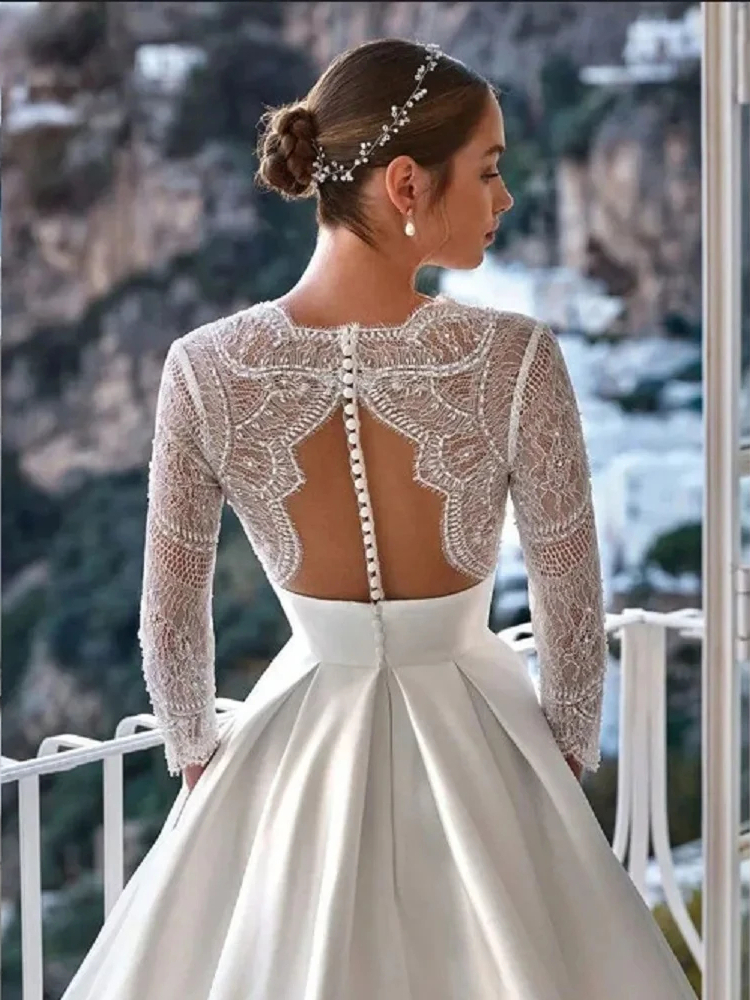 Les manches longues sont également en dentelle et se finissent par des poignets élégants, tandis que la jupe part de votre taille haute et s’évase généreusement, flottant autour de vous à chaque pas.
